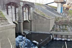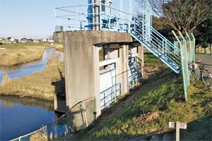 新河岸川の水を荒川に流すための渋井水門。新河岸川の増水時に、より多くの水を流すために、水門を一門から二門に増やすことが検討されています。 |