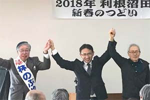 群馬県みなかみ町で利根沼田新春のつどい。林のぶゆき町議、原沢よしてる町議が町政報告とあいさつ。私が国政報告。