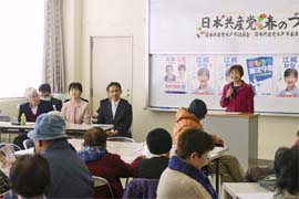 水戸市の春のつどい。2月20日告示の城里町議選挙で2期目に挑戦するふじさく芙美子町議、年末の県議選で再選めざす江尻かな県議、田中まさき・中庭次男・土田きよみの水戸市議3人があいさつしました。