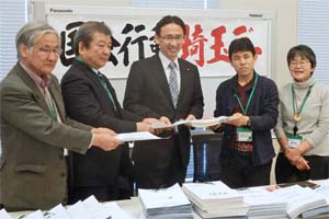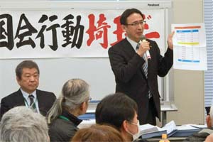 国会行動埼玉デーの院内集会で国会情勢報告。たくさんの署名を受け取りました。