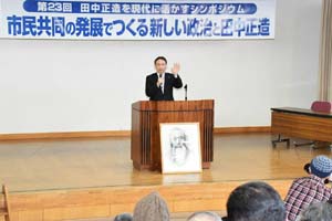 足尾鉱毒反対でたたかったことで知られる田中正造の生地・栃木県佐野市で18日、第23回「田中正造を現代に活(い)かすシンポジウム」が開かれました。テーマは「市民共同の発展でつくる新しい政治と田中正造」で、県内外から約140人が参加しました。