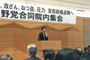 日報隠ぺい、加計疑惑、厚労問題、森友問題、教育介入と、熱い焦点となっている問題について、先頭に立って追及してきた各党議員から報告。森友問題では、辰巳こうたろう議員が発言。安倍政権を退陣に追い込もうと訴えました!