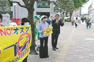 米空軍の特殊作戦用CV22オスプレイが米軍横田基地(東京都福生市など)に5日到着したことに対し、所沢駅前で14日、「NO! オスプレイ」緊急アクションが行われました。主催は同実行委員会。日本共産党の塩川鉄也衆院議員や伊藤岳参院埼玉選挙区候補、柳下礼子県議が参加しました。
