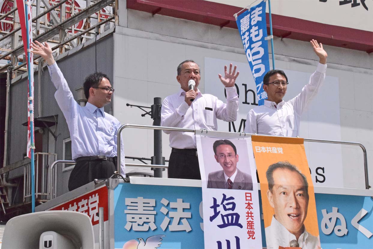 大宮駅東口で憲法記念日の宣伝行動。伊藤岳さんと一緒に訴えました。