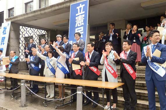 カジノ解禁に反対するパレード。日本共産党、立憲民主党、国民民主党、社民党、自由党の国会議員が参加者を激励。