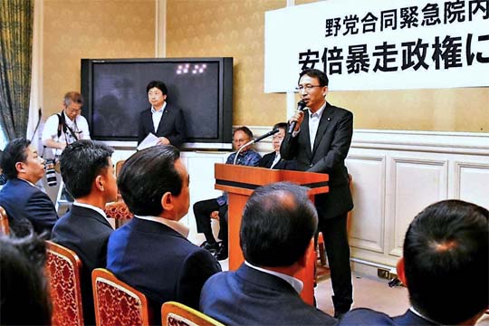 日本共産党、立憲民主党、国民民主党、無所属の会、自由党、社民党は18日、「安倍暴走政権に『怒!』野党合同緊急院内集会」を開き、一致結束して安倍政権打倒をめざす決意を表明しました。