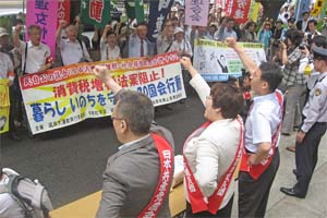 民主・自民・公明3党の談合による消費税増税、社会保障改悪を許すな―――全商連や全労連など民主団体、実行委員会がおこなった消費税大増税など「一体改革」反対国会請願デモや全日本年金者組合がおこなった「年金引き下げるな!消費税増税反対!かがやけいのちの行進」を激励し、埼玉土建から「消費税及び税務行政等に関する要請」をうけ懇談した。