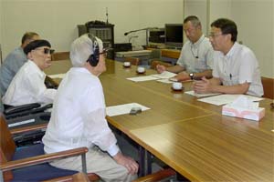 懇談には、入園者自治会の藤田三四郎会長、ハンセン病違憲国家賠償訴訟全国原告団協議会の谺(こだま)雄二会長、同自治会の岸従一常任委員らが出席。職員不足の現状や介護員の多くが身分保障のない賃金職員となっている実情などを聞いた。