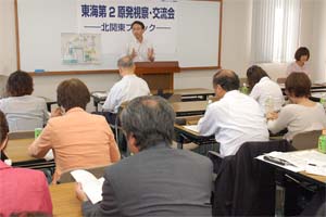 視察後、村内で交流会が開かれ、茨城県原発を考える会会長で元覚県議の中村敏夫さんが、東海第2原発が東日本大震災の地震、津波で主電源と予備電源を喪失して冷却が十分に進まず、ベントは170回に及び、福島の過酷事故と紙一重の状態だったことを説明。大名美恵子、川崎篤子の両党村議からは、『脱原発』を宣言した村長のもとでの、議会の動向について報告があった。