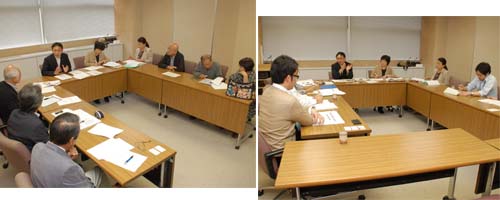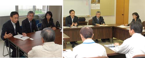 北茨城市で、雇用促進住宅避難の方と懇談(左)と、市役所担当から聞き取り(右) |