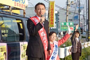 聞き取りの後、衆院茨城2区の梅沢たつこさんとともに街頭演説。大震災からの復旧・復興に全力をつくしていきたい。アメリカや財界いいなりで、消費税増税や原発を推進し、くらしを壊す自民党型の古い政治との決別に全力をあげる日本共産党を大きく伸ばしていただきたい。