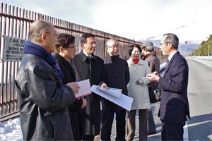 | 「キャンプ富士」の前で、高木理文党御殿場市議から説明を聞く |