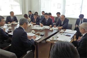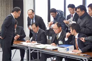 | 御殿場市役所担当者からのヒヤリングで、新たな資料を提示し説明。後ろで地元マスコミ記者が注目 |