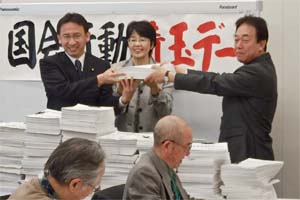 参加者の顔が見えないほど高く、たくさんの署名が積み上げられた。民意にそむく政権に未来はない。国民的なたたかいで反撃しよう。