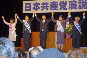 栃木県佐野市で、市議選(4月7日告示、14日投票)での現有3議席確保と参院選躍進めざした演説会。同市議選をたたかう現職のつるみ義明、岡村けい子、新人の岡野むつこの3氏、参院栃木選挙区の小池一徳さんとともに訴え。