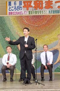 埼玉県所沢市の航空記念公園野外ステージで、ところざわ平和まつりが開かれ、参院埼玉選挙区の伊藤岳さんとともに参加しあいさつ。