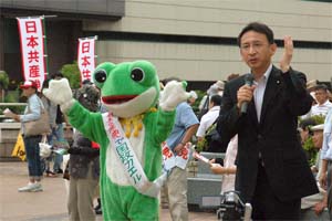 大宮駅西口デッキの党さいたま地区の宣伝行動に合流。200人近い参加で元気に行動。紙智子参院議員、辻もとみ予定候補と一緒でした。カエルも一緒。