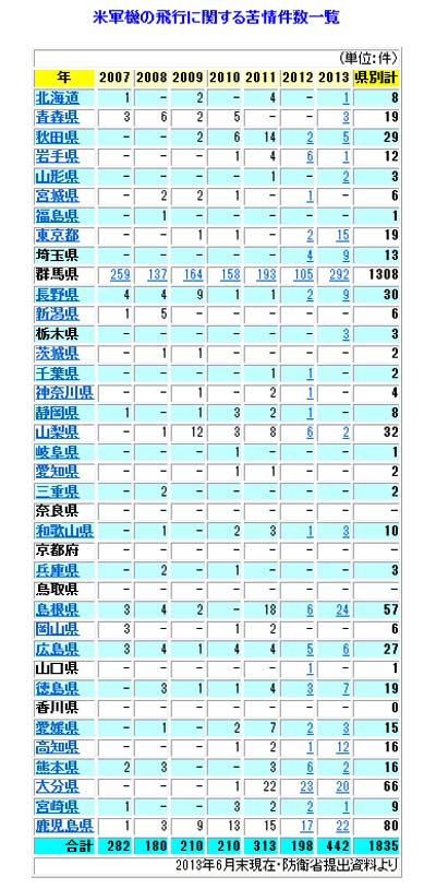 米軍機飛行被害/防衛省から2013年4~6月分の苦情受付状況表を入手
