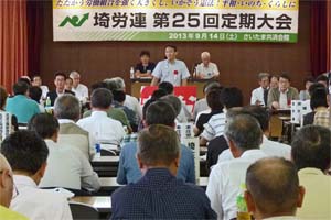埼労連定期大会であいさつ。越谷・松伏などでの竜巻被害では、越谷労連の被災者支援活動とともに、全県からカンパも寄せられた。職場に根ざし、地域に根ざした埼労連ならではの活動に敬意。