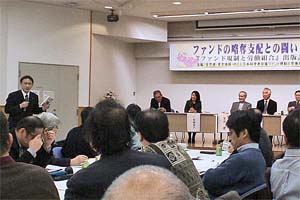 全労連等が主催する「ファンドの略奪支配と闘うシンポジウム」に参加し、あいさつ。国会論戦の内容を紹介し、今後も国会で取り組んでいくことを訴えました。