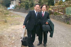 党大会会場に向かう途中で、井上さとし参院議員と。みかん 畑の続く道を小雪が舞う中、30分ほど登っていきます。私は少し膝がガクガクかも。