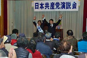 栃木県壬生町議選(3月18日告示、23日投票)応援の演説会。小貫(おぬき)さとる町議と一緒に訴えました。