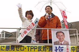 栃木県大田原市議補欠選挙(定数1、立候補3)の告示日。日本共産党の秋山ゆきこ候補の応援に駆けつけました。
