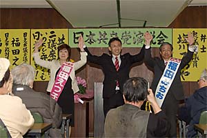 4月6日告示の日光市議選に向けた演説会に出席。福田えつ子市議と福田みちおさんを市政へ押し上げ、1→2名をめざします。