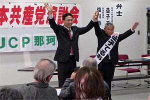 4月15日告示、20日投票の栃木県那珂川町議選。二期目をめざす益子てるお議員の応援に駆けつけました。