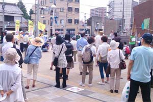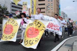 蒸し暑かったけれど、沿道ではたくさんの人がパレードに注目し、家を出て手を振る人やクルマから声援を送ってくれる人もいました。原発推進勢力とたたかう元気を皆さんからもらいました。