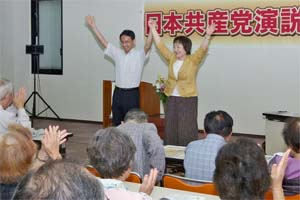 茨城県常陸太田市の演説会に参加。常陸太田市議選(7月20日告示、27日投票)の予定候補である宇野たか子市議と一緒に訴えました。