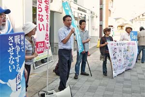 埼玉県平和委員会をはじめ市民団体と日本共産党狭山市議団が共同して市民にアピール。憲法9条を壊し、立憲主義そのものを壊す暴挙は許せません。