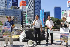 中央実行委員会の大河原貞人事務局次長が「沖縄県民と連帯し、辺野古に新基地をつくらせず、普天間基地(沖縄県宜野湾市)を無条件撤去させる運動を広げよう」と訴え。東京電力福島第1原発事故を受け、福島県浪江町からいわき市に避難する男性が飛び入りでビラを配布してくれた。この男性は、原発ゼロを求める首相官邸前抗議行動に参加するために上京したとのこと。