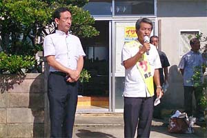 読谷村議選の告示日、イサ真武(しんぶ)候補への支援を訴え。