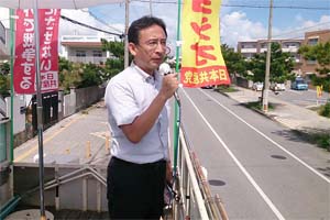 宜野湾市内でチネンヨシオ候補の応援演説。