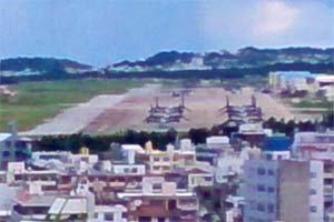 | 嘉数高台から普天間基地を見ると、15機のオスプレイ。そのうち2機は、横田基地から昼過ぎに帰投したもの。全国が訓練場です。岩国基地に移駐したはずのKC130も。「本籍地は岩国だが、現住所は普天間」であり「沖縄の負担軽減」はごまかしです。 | ![]() |