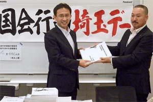 国会行動・埼玉デーであいさつ。集団的自衛権行使容認の閣議決定撤回を求める署名を受けとりました。