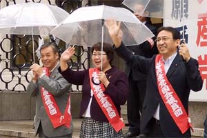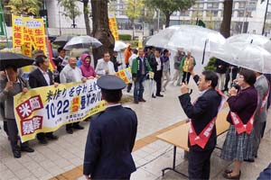 全労連、全農協労連、新婦人、農民連らによる「米つくってメシくえねえ」米作りを守れ 主食を守れ!10・22緊急昼休みパレードを穀田さん、高橋さんと一緒に激励。雨の中