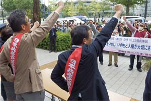 「いのちまもる・憲法いかす10・23国民集会」後の参加者による国会請願デモを激励。