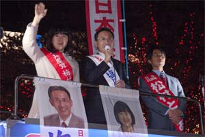 イルミネーションが輝く夕方の浦和駅西口。安倍首相の解散表明を受けて、梅村さえ子さん、松村としおさん(衆院埼玉1区予定候補)と訴え。
