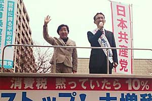 宇都宮市内で街頭演説。野村節子党県副委員長と一緒です。