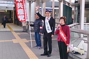 狭山市駅西口で広森すみ子狭山市議(埼玉9区予定候補)と一緒に朝の宣伝行動。