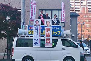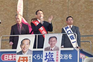 上尾駅東口の街頭演説。戸口佐一埼玉6区予定候補と訴えました。伊藤岳さんも一緒です。