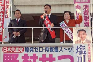 宇都宮駅西口で野村節子栃木1区候補と栃木県内の第一声。冷たい北風が吹きすさぶ中でも、力強く訴える野村候補。