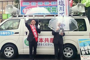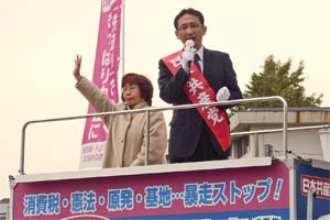 駅前では助手席に座っている私に、窓越しに握手を求めて「本当に頑張ってよ、頼むよ!」という男性。「戦争になっちゃいけない」という年配の男性、「こどもたちを戦争に行かせないために頑張ってください」という女性。期待に応えて全力を挙げます!