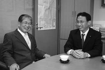 | 対談する赤嶺政賢(あかみね・せいけん)衆院議員(左)と塩川鉄也(しおかわ・てつや)衆院議員(右) |