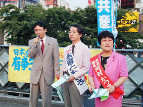 有事関連三法案が、参院本会議で強行可決されたことをうけ7日夕刻、埼玉県川口駅東口で永塚ともひろ衆院2区候補、河村勝子県議と川口市議団7人のほか、塩川鉄也衆院議員もかけつけ、アメリカの戦争に協力し、国民の権利と自由を制限する有事法制の内容を紹介しながら、発動を許さない世論と運動を広げようと呼びかけました。