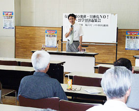 有事法制を許さない栃木県民連絡会は21日、塩川議員を講師に学習会を開きました。塩川議員は、有事法制について「アメリカの無法な戦争に国民を強制動員する憲法違反の法律だ」と糾弾。法案の発動を許さない戦いの重要性を強調しました。また、イラク特措法が米英軍のイラク軍事占領支援のために自衛隊を派兵するのが狙いと、その危険性を明らかにし、廃案にむけた運動をよびかけました。ある参加者は「終戦を七歳でむかえた。学校帰りに防空壕に逃げ込んだことを覚えている。戦争はいやだ。有事法制が成立し、悔しいかったが、この法律に実効性を持たせない運動をやりたい」と語っていました。