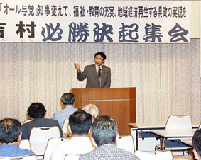 群馬県知事選をたたかっている桐生市の「民主県政をつくる会」は、25日必勝決起集会を開きました。集会に出席した塩川てつや衆院議員は、イラク特措法案をめぐる情勢にふれながら「平和の問題でも医療・福祉の問題でも国以上のことをやらず、むだなダムにはこだわり、県民のくらしの大変さをわかろうとしない小寺県政を今こそ転換しよう」とのべ、国の悪政から住民生活を守る吉村候補への支持を訴えました。