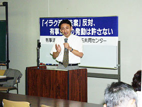 有事法制に反対する埼玉共同センターは27日夜、さいたま市内でイラク特措法案と有事法制の問題について学習・交流会を開きました。